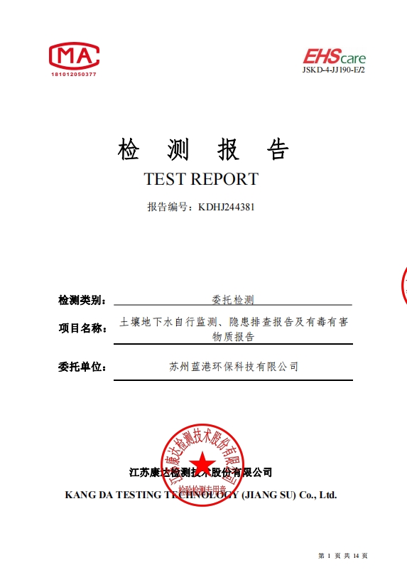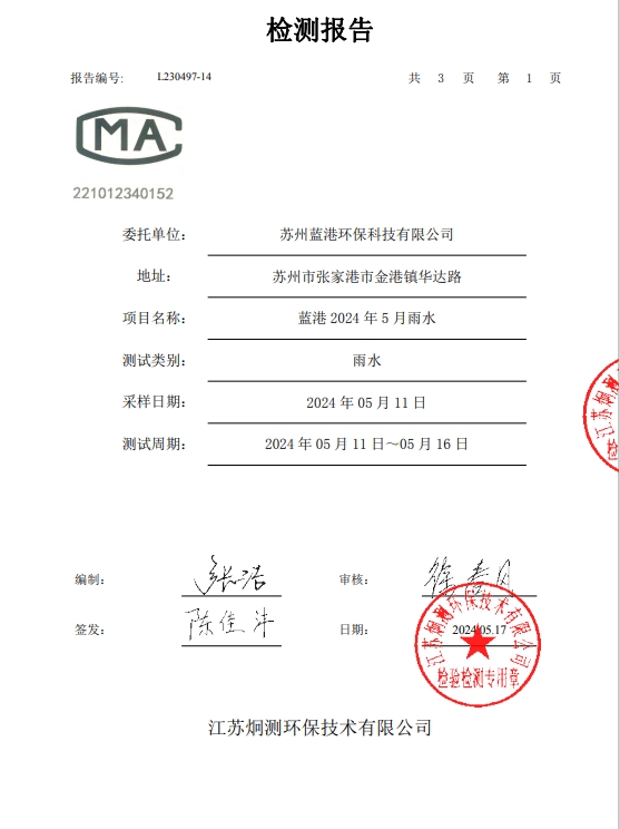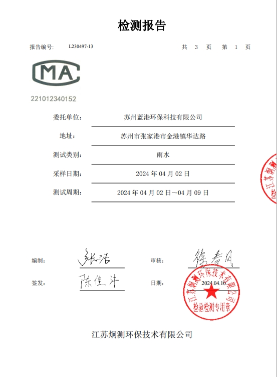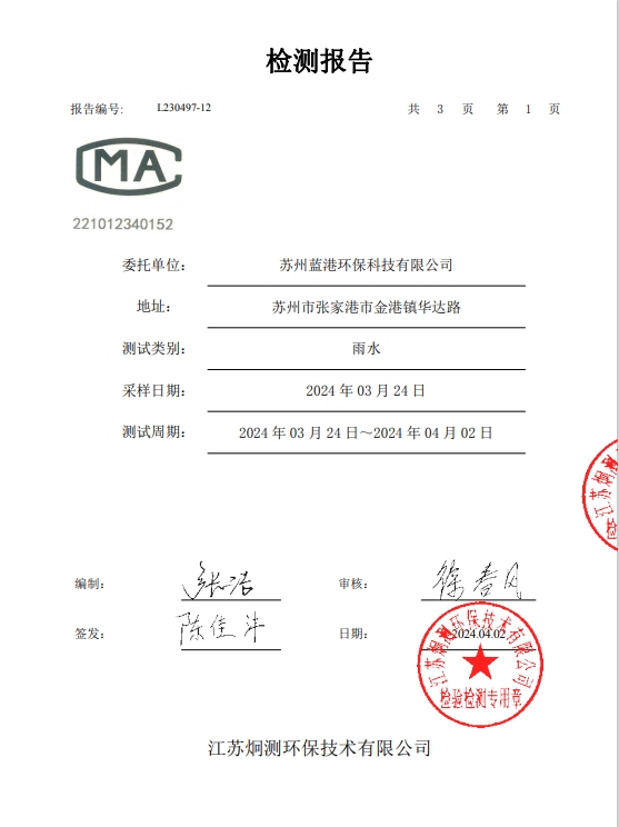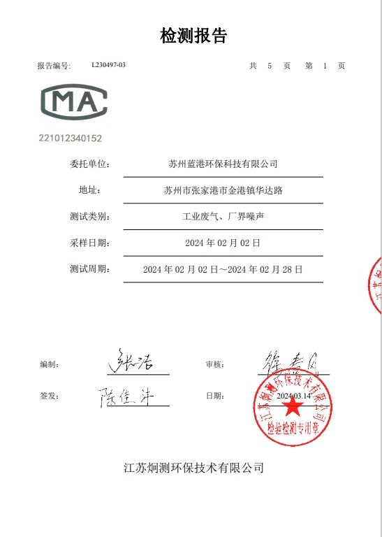 蘇州藍港環(huán)保科技有限公司檢測報告已公示,詳情請查...